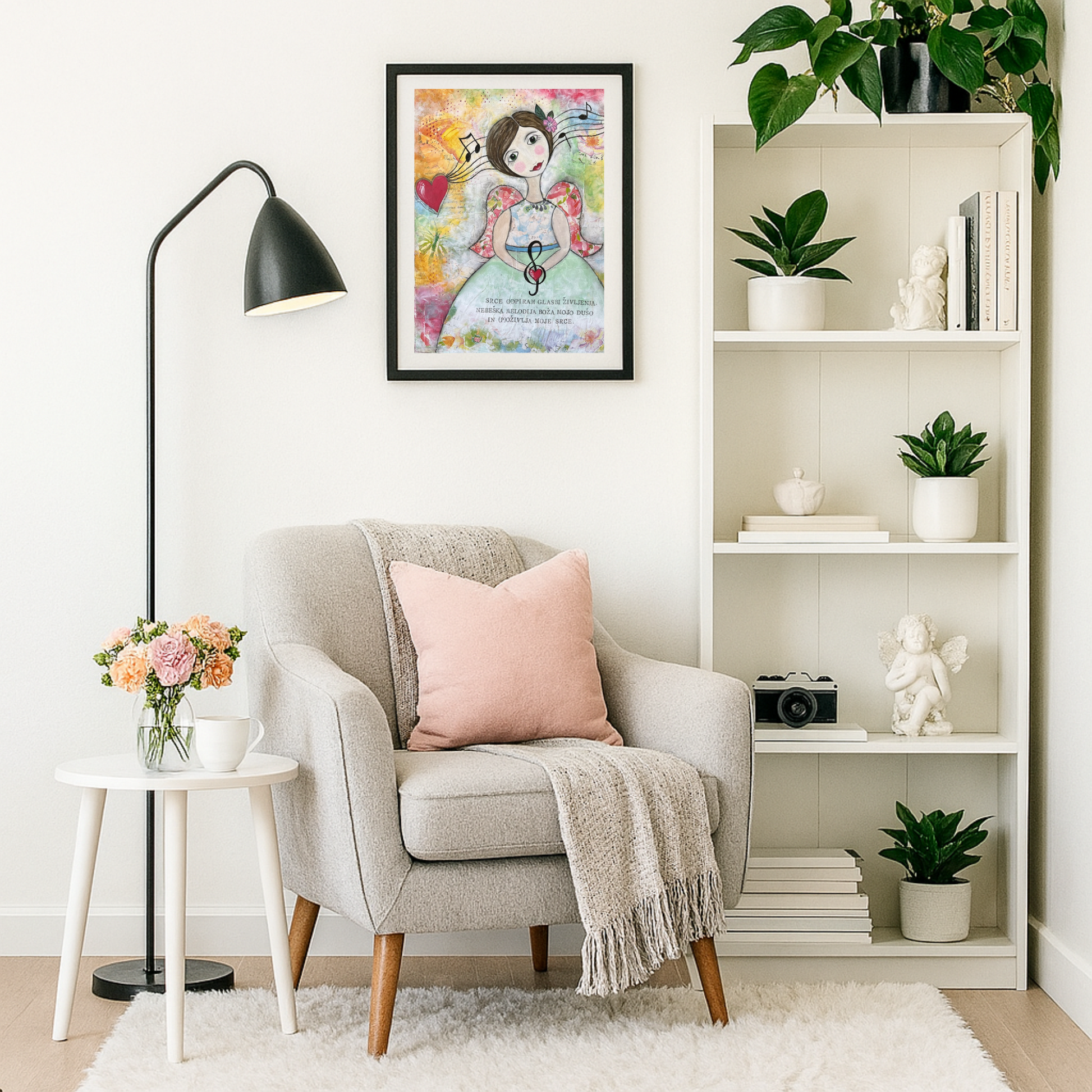 Glasbena je angelčica uglašenosti z višjim jazom, ki domuje v božanskem delu našega bitja. Nežno vas spodbuja, da prisluhnete pesmi svojega srca. Nagovarja vaše želje, sanje in najgloblje strasti. Prihaja iz globine vašega neminljivega bistva in vas z edinstveno melodijo nežno nagovarja, da sledite svojemu srcu. Da zaupate pesmi svojega srca, ker je odsev vaše duše. Navdihuje vas, da z neomajnim zaupanjem vase sledite svoji poti z zavedanjem, da je Življenje tu za vas - da vas boža, podpira in neguje.