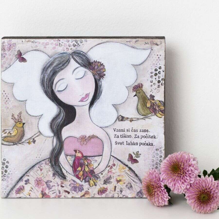 Vaša najljubša angelčica je natisnjena na les, ki ustvarja topel, naraven videz. Ker je les lahek in prijeten na dotik, izdelek ne obremeni prostora, temveč ga nežno obogati in ustvarja negujoč občutek domačnosti.