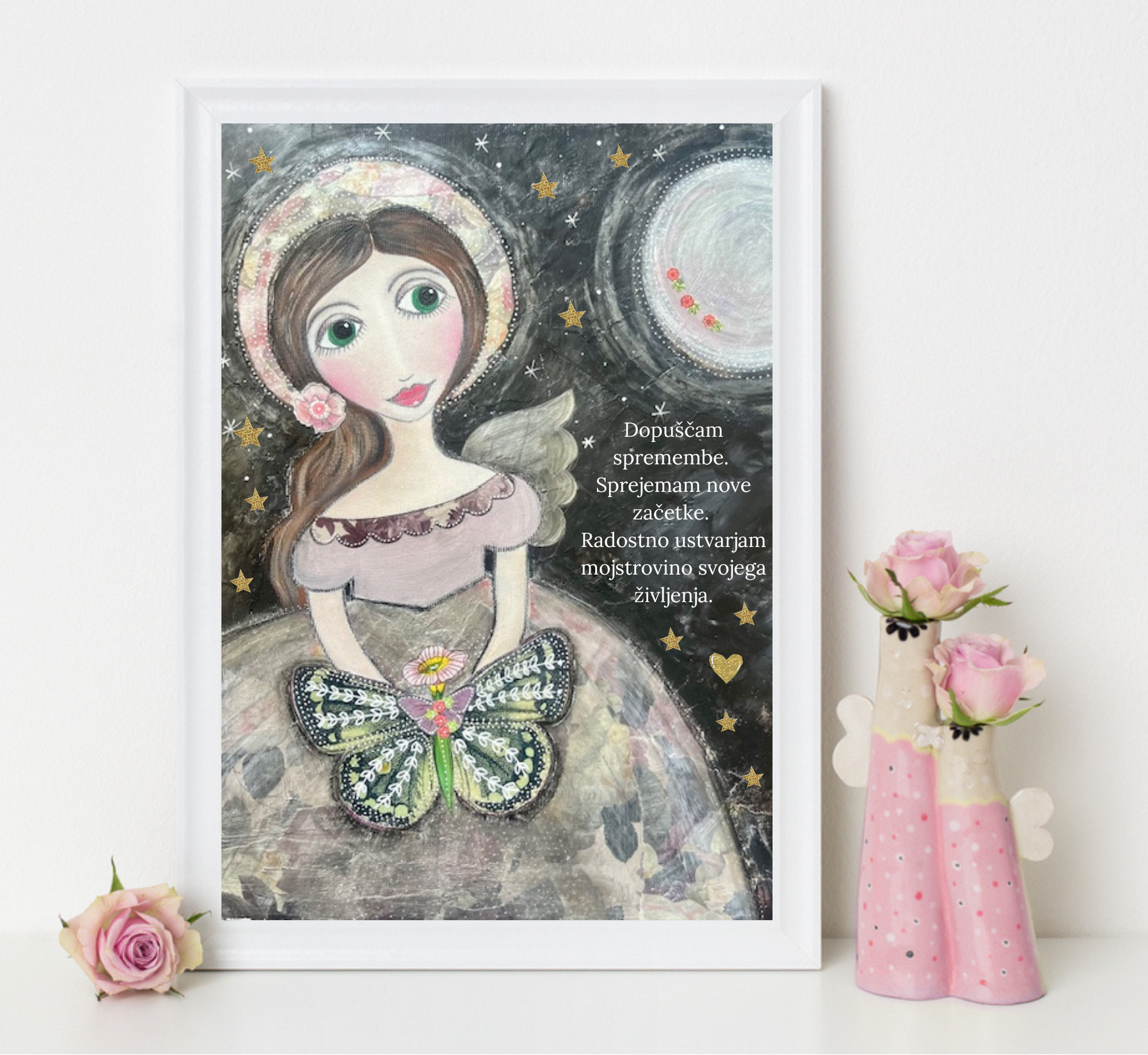 Angelčica Prerojena vam prinaša podporo v trenutkih, ko iz svojega življenja izpuščate staro in ustvarjate prostor novemu. Ko ste pripravljeni mehko spustiti, kar vam ne služi več in se preroditi v pristnejšo različico sebe. Njena prisotnost vas nežno spomni, da so spremembe naravni del življenja. In da je vaše srce dovolj močno, da lahko drži ljubeči prostor vsemu, kar se želi preroditi. Prerojena vam stoji ob strani, ko ste pripravljeni na novo poglavje življenja, začutite klic k notranji preobrazbi in si želite zavestno ustvarjati življenje polno ljubezni, radosti in svobode.